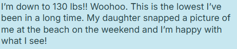 “I’m down 15 pounds! Things are going well and I’m happy I finally found something that works for my body! Having bowel movements everyday for the first time in my life and I never feel bloated anymore. Woohoo!!”
